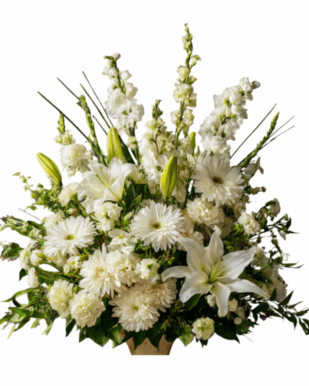 Honra la memoria de un ser querido con este arreglo funerario elegante y sereno, elaborado artesanalmente con flores naturales frescas cuidadosamente seleccionadas.