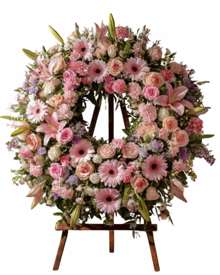 Honra la memoria de un ser querido con este arreglo funerario elegante y sereno, elaborado artesanalmente con flores naturales frescas cuidadosamente seleccionadas.